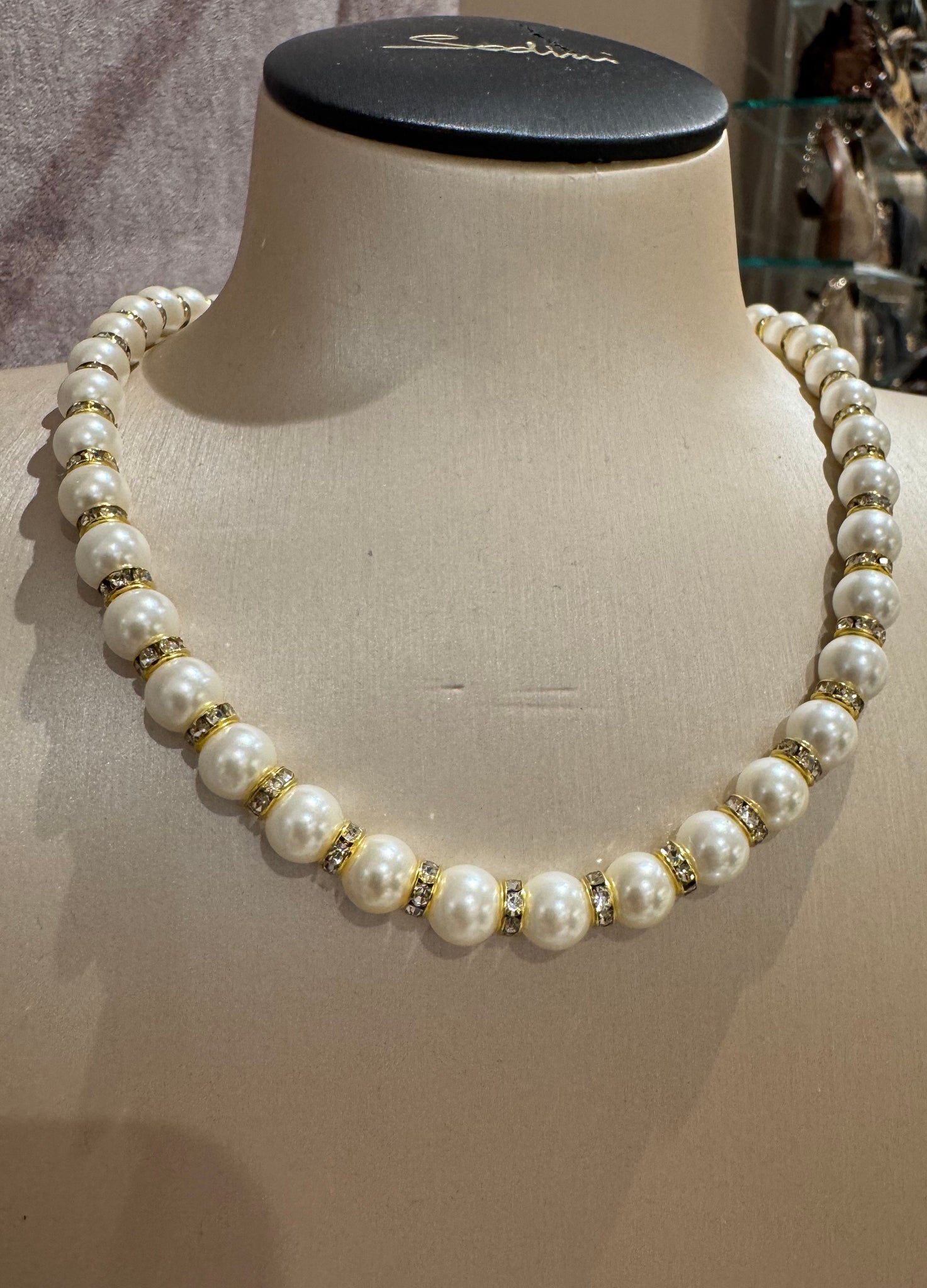 • Girocollo in perle e piccoli anelli con strass