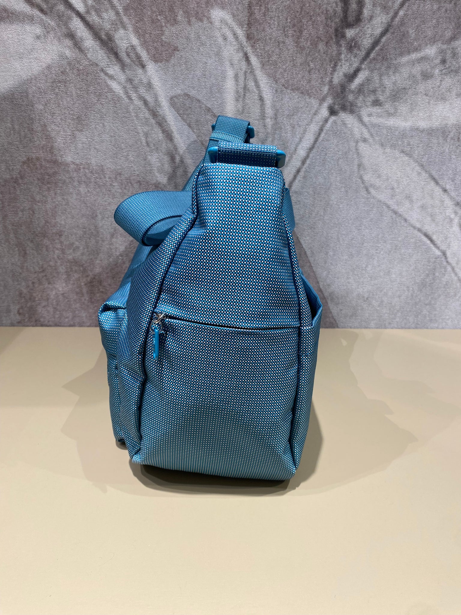 - Borsa a tracolla media con tasca frontale e zip in tessuto.