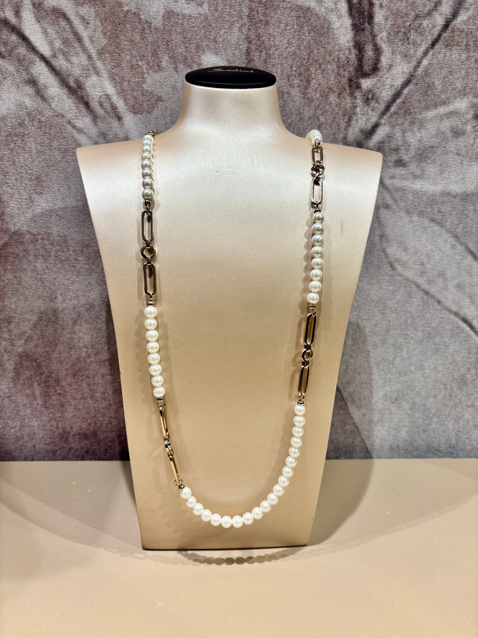 • Collana lunga con sezioni alternate, alcune con catena altre con un filo di luminose perle  nella cromia del bianco e oro